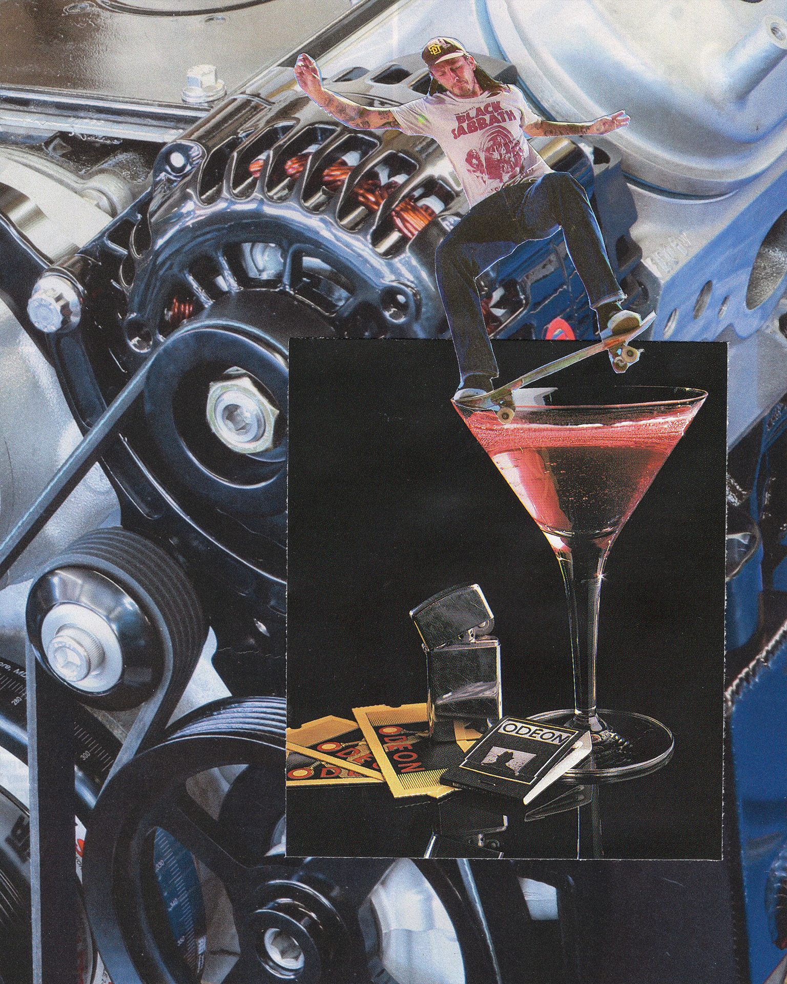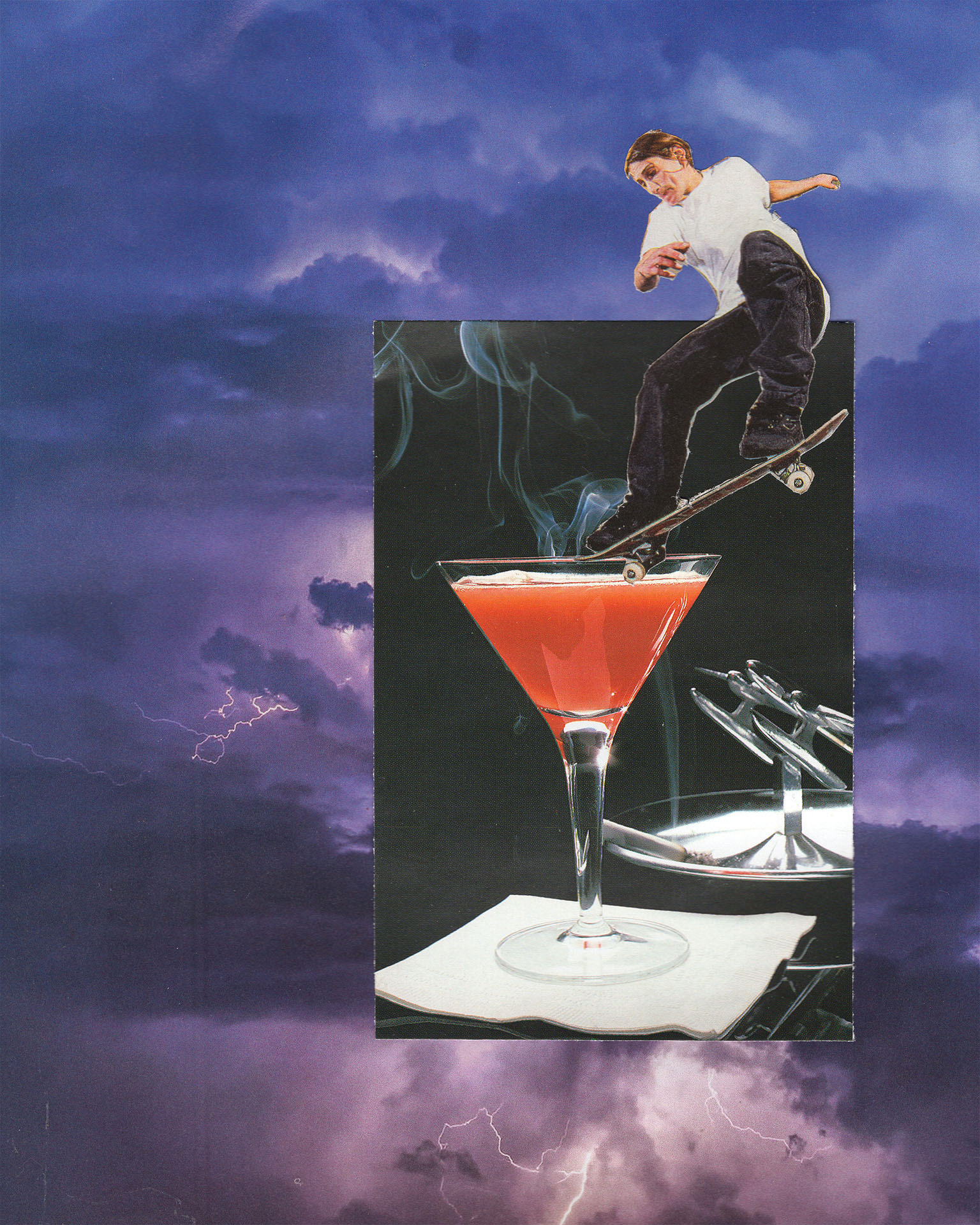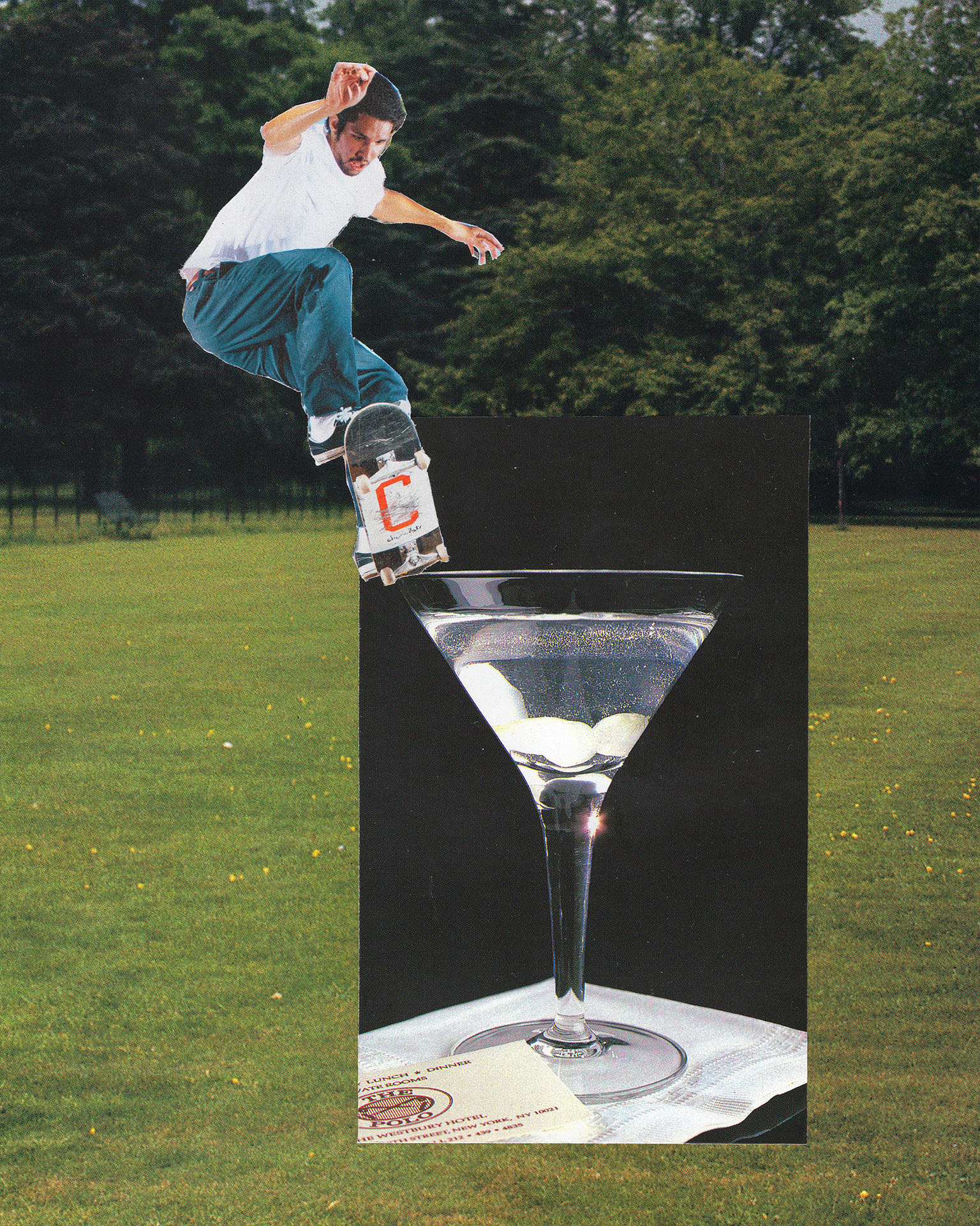 Skatin' not Stirred is a collage series featuring iconic drinks and amazing skaters, created using the New York Bartenders Guide and Thrasher Magazine.